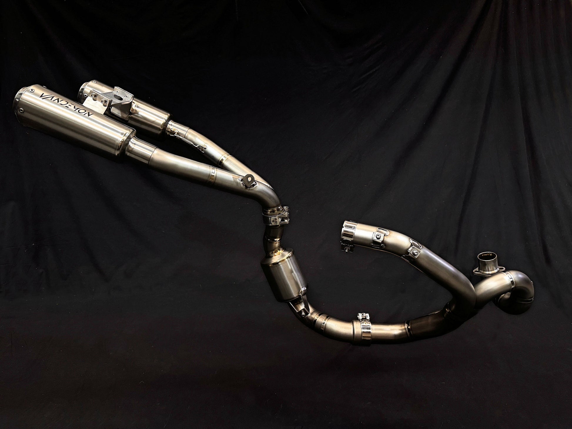 Los sistemas de escape Vandemon logran el máximo rendimiento y estilo con un gran sonido utilizando las últimas técnicas de fabricación y materiales exóticos como el titanio, lo que hace que el sistema de escape sea significativamente más liviano y con menor retención de calor que el sistema OEM. Además, la calidad de la soldadura es insuperable, con soldaduras ultrasónicamente perfectas, algo que los clientes de Ducati esperarían y apreciarían de una marca de motocicletas tan icónica que solo complementa a esta gran marca.