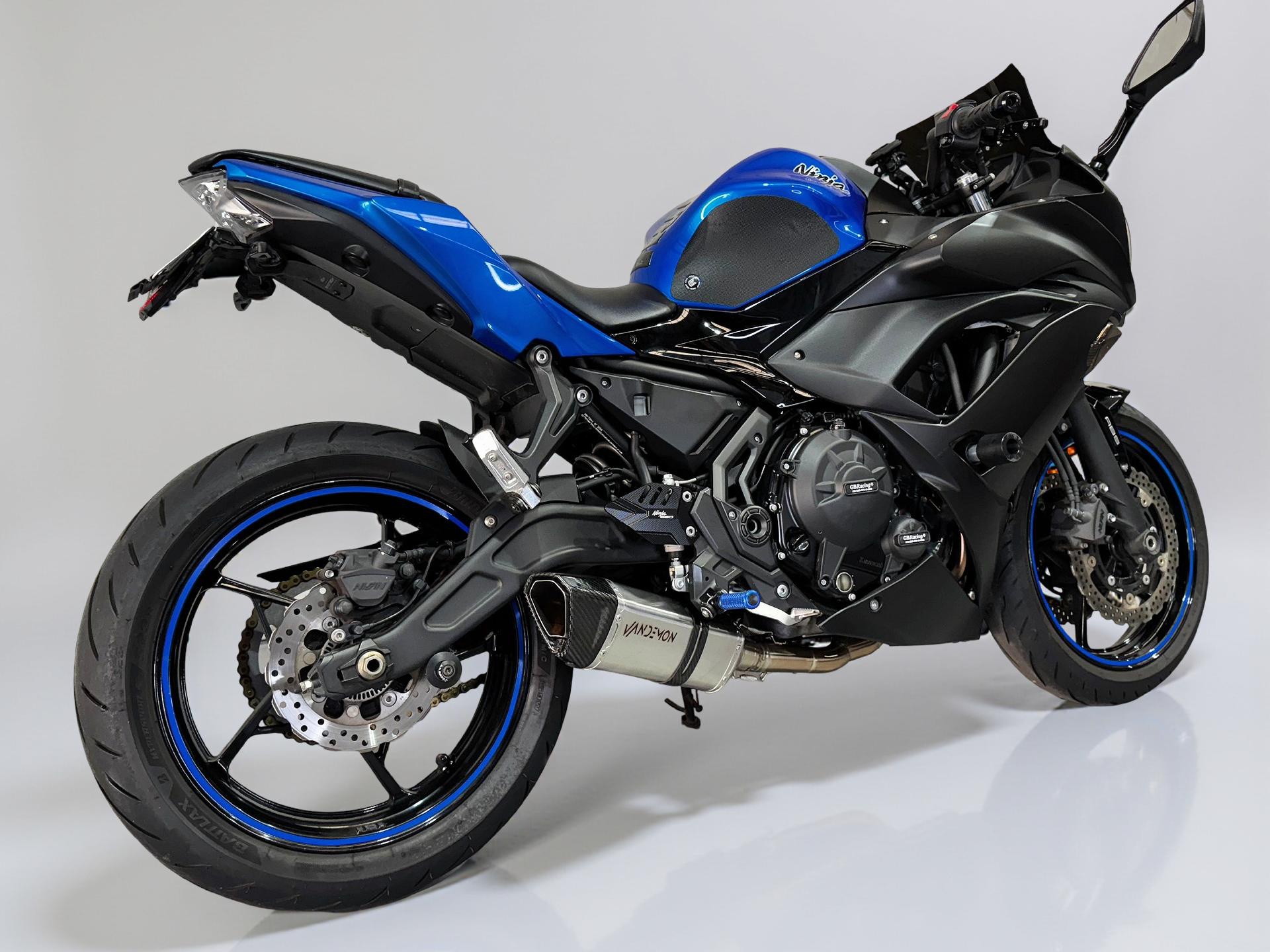 Los colectores de escape de acero inoxidable de la Kawasaki Ninja 400 utilizan un silenciador de titanio con punta de fibra de carbono . El sistema completo es mucho más ligero que el escape de acero OEM y la reducción de peso resultante mejora notablemente los cambios de dirección y la aceleración y reduce las distancias de frenado. Además, las diferentes dimensiones de los tubos intermedios cónicos permiten un aumento notable del par motor en el régimen medio y de los caballos de fuerza máximos, así como el inconfundible sonido Vandemon.