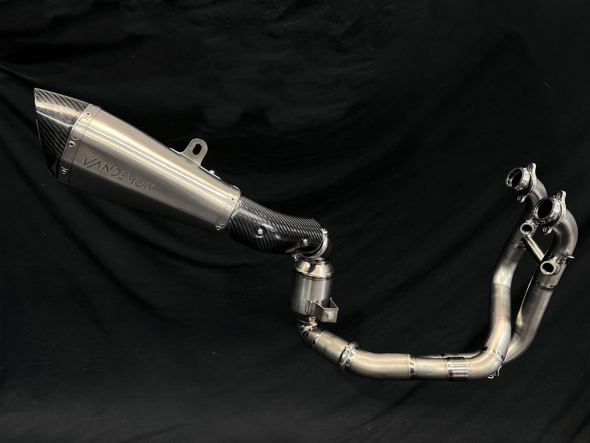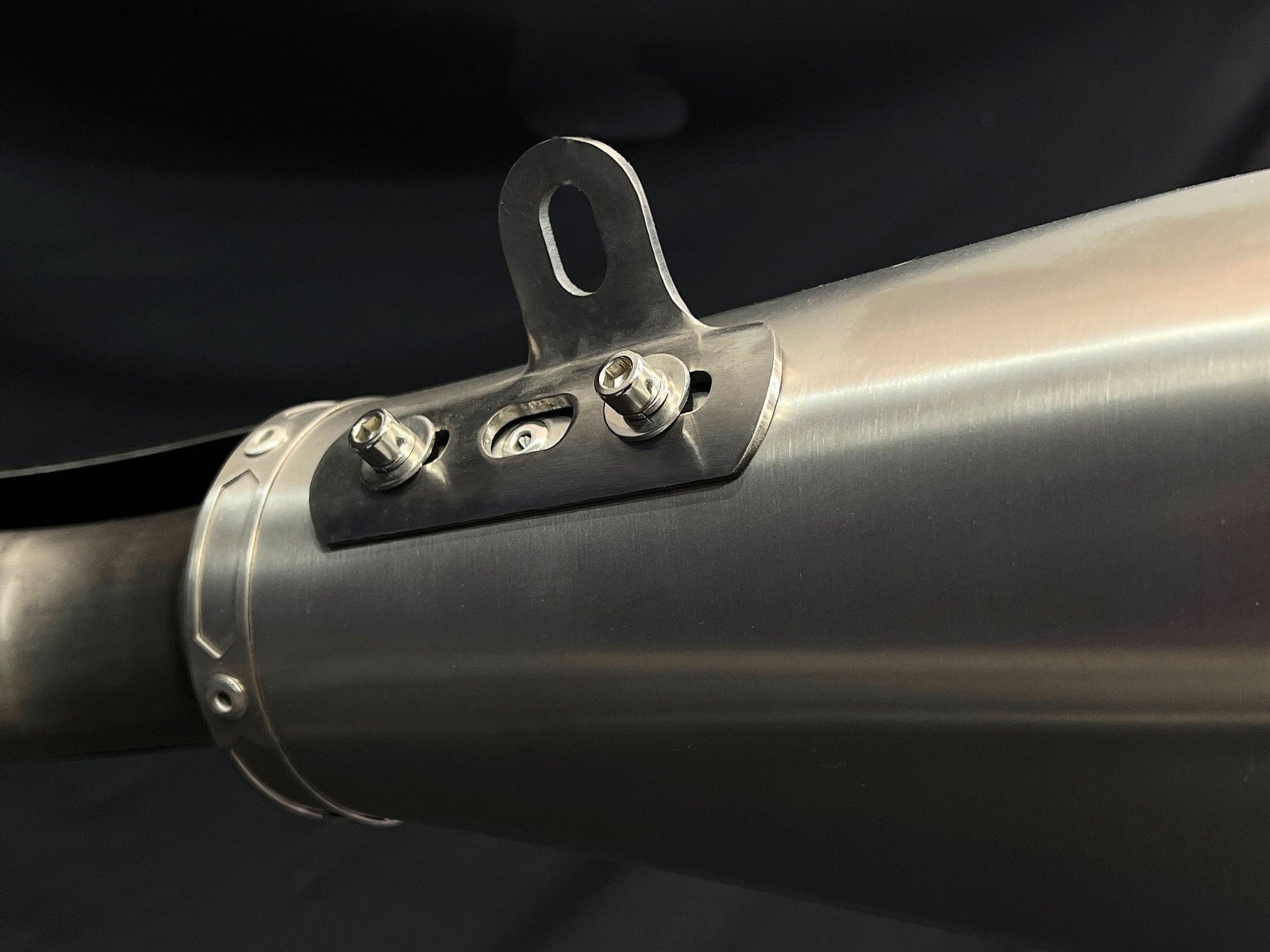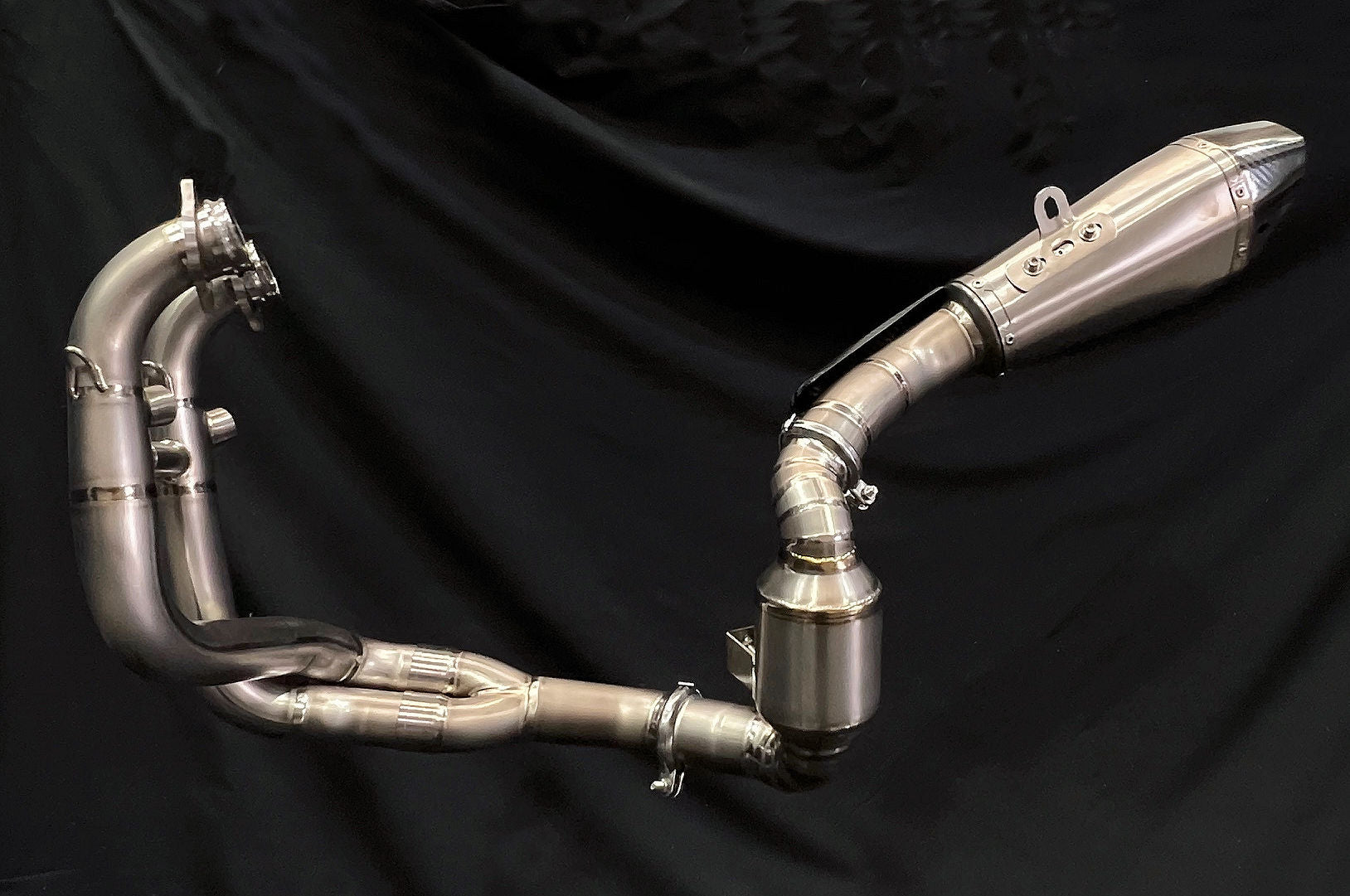 Este escape está fabricado con titanio japonés Ti1 de la más alta calidad, lo que reduce el peso en comparación con el escape OEM de acero inoxidable. También elimina el pesado convertidor catalítico, que afecta el rendimiento y el sonido. El diseño permite a los tuneadores maximizar el rendimiento del motor de dos cilindros manteniendo el silenciador original o utilizando el silenciador de titanio provisto para obtener resultados aún mejores.