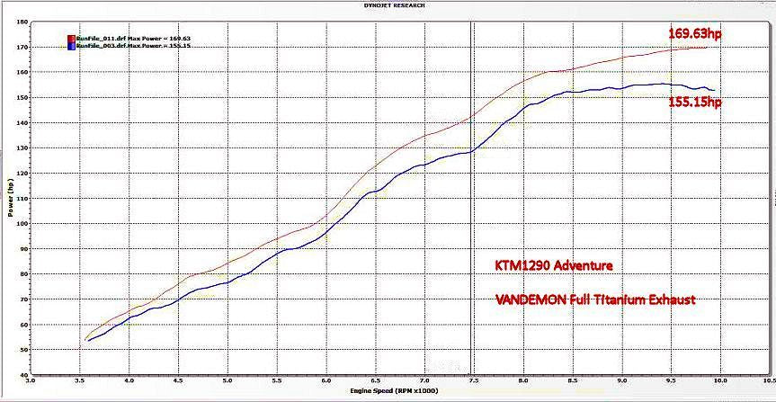 El silenciador es completamente de titanio, excepto por una elegante tapa de fibra de carbono, y tiene un sonido agresivo a juego. Además de mejorar la aceleración, el manejo y la distancia de frenado, este sistema liviano mejorará el rendimiento en 14 hp (se muestra el dinamómetro 1290) cuando se usa con un dispositivo de corrección de combustible.