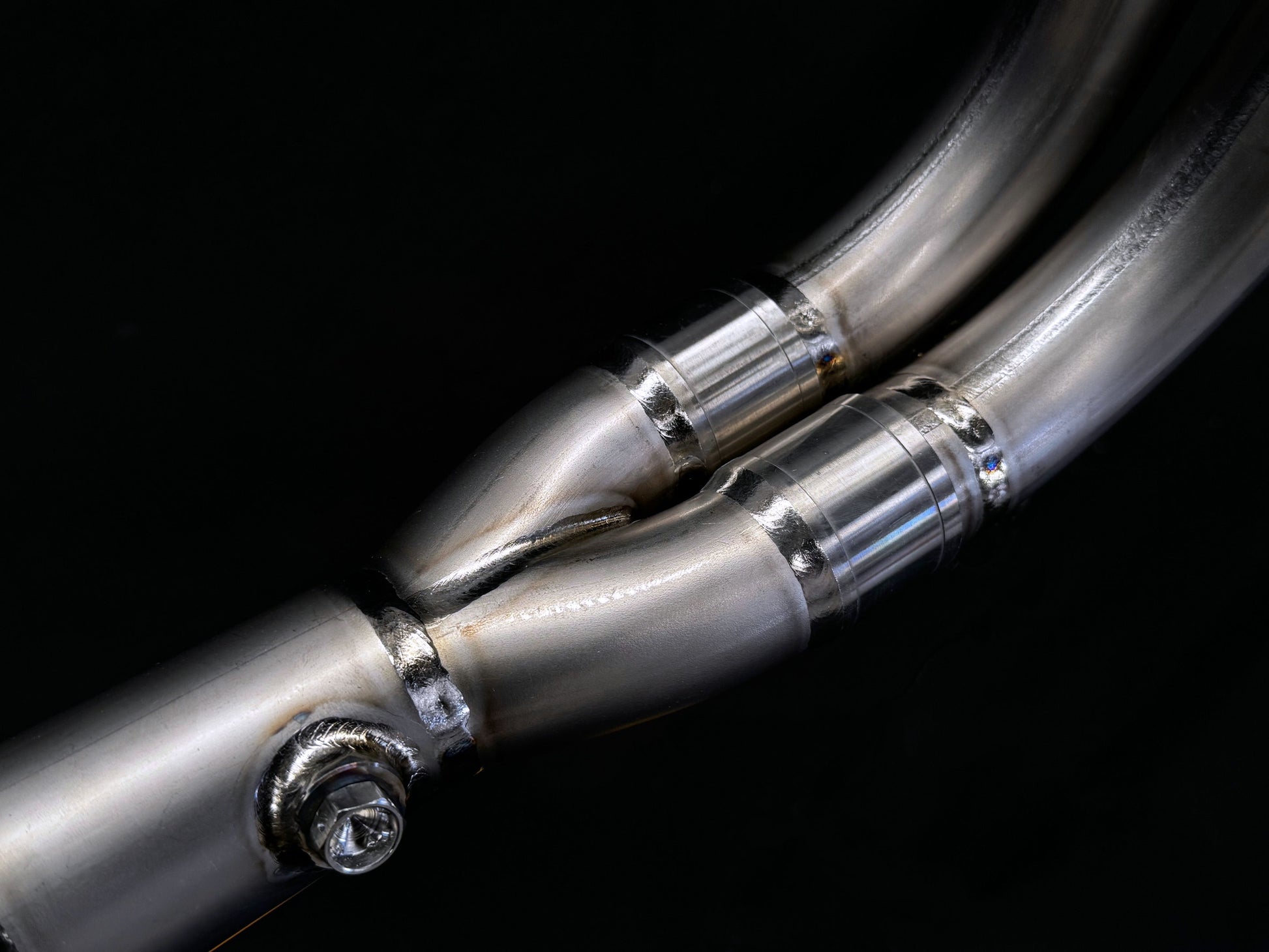 Este sistema de escape elimina el convertidor catalítico y no utiliza placas deflectoras ni dispositivos fijos de retardo de sonido, lo que da como resultado un torque de rango bajo a medio significativamente mejorado, lo que es útil para recorridos de bajas RPM.