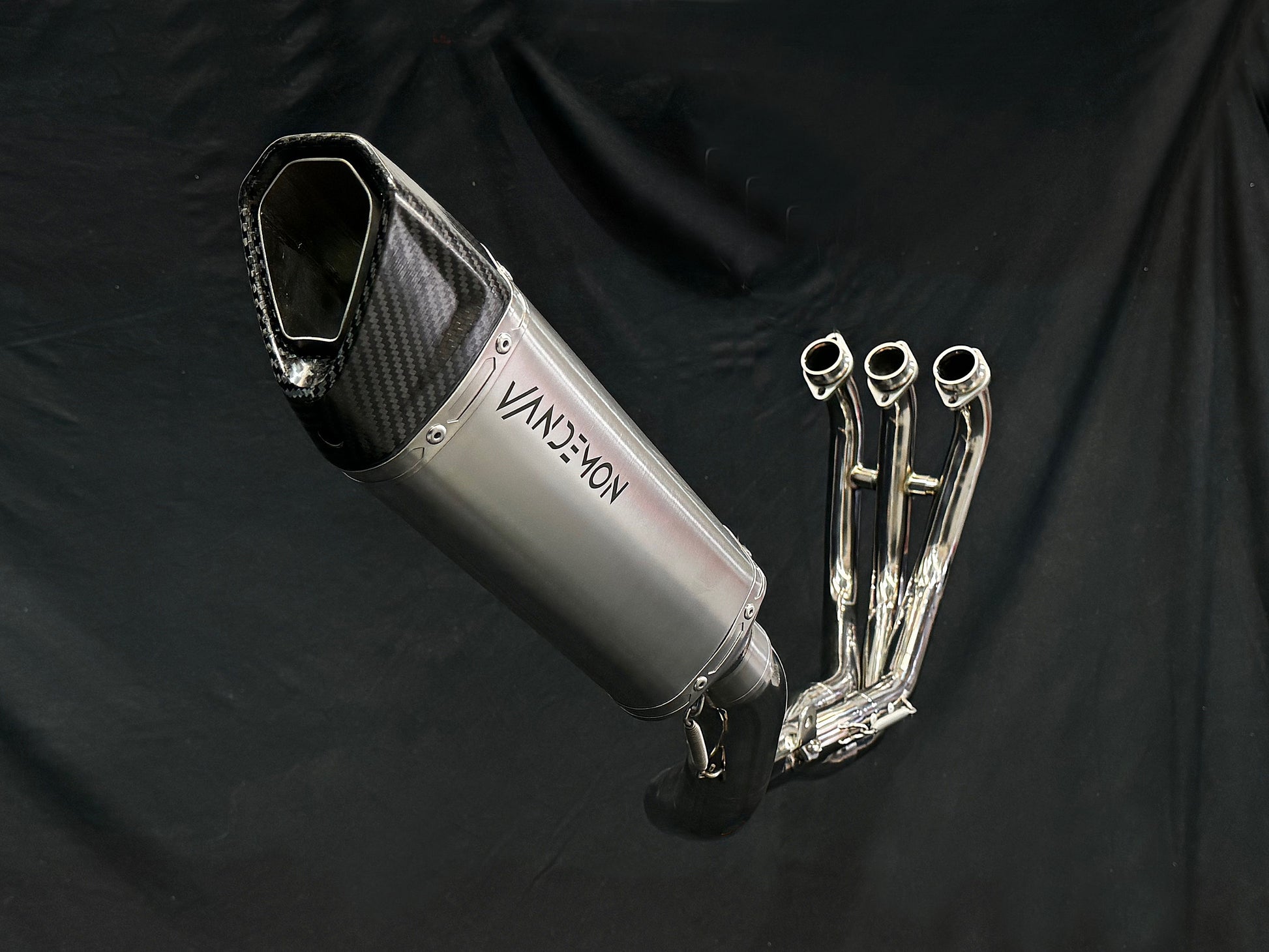 While Yamaha’s MT09-FZ09, XSR900 and XSR900 GP models benefit from a powerful three-cylinder engine, the true auditory and performance potential is constrained by the factory Euro 4-5-compliant exhaust system. Vandemon’s titanium exhaust system addresses this limitation by eliminating the restrictive catalytic converter and dramatically enhancing exhaust flow.